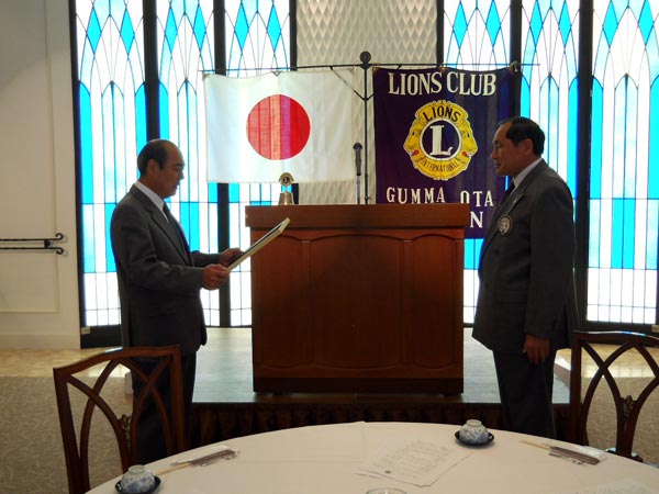 新入会員の入会者は守屋清様です。会長からラペルボタンとランチョンバッチの装着をされ、ライオンズの誓いを行い晴れて太田ライオンズクラブの一員「守屋清L」が誕生しました。