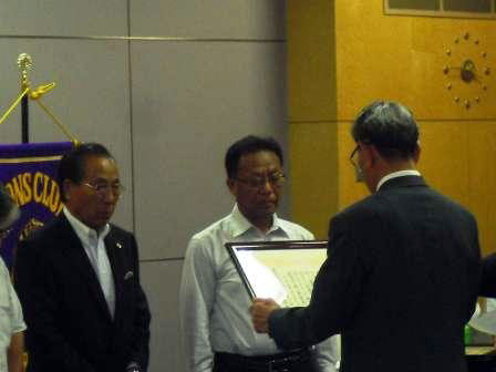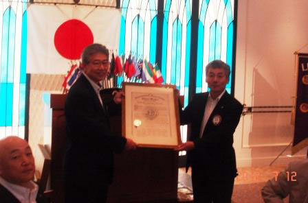 ライオンズクラブの発展に大きく貢献いただきました。さらに、100年へ向けて時代の即応したライオニズム高揚とともに、アクティビティを重ね地域から世界へ不変の理念をもってご貢献いただくことを期待いたします。」