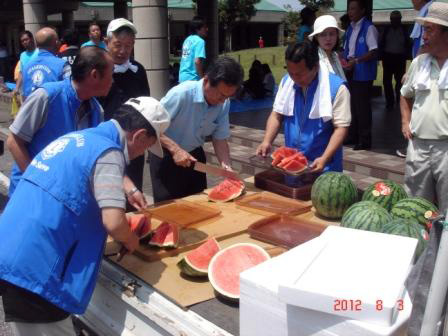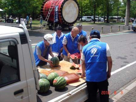 昨年度に引き続き、太田青年会議所主催の100人の子供たちが5日間にわたり100キロを踏破する事業に3日目に当たるこの日、太田市の尾島庁舎での昼食会場で会場づくりやスイカの提供など実施。
