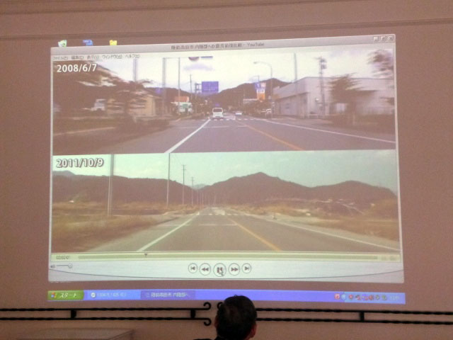 藤田会長エレクトとしての強い希望があり、動画を使った被災地の現在と被災前の街並みの様子を
