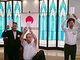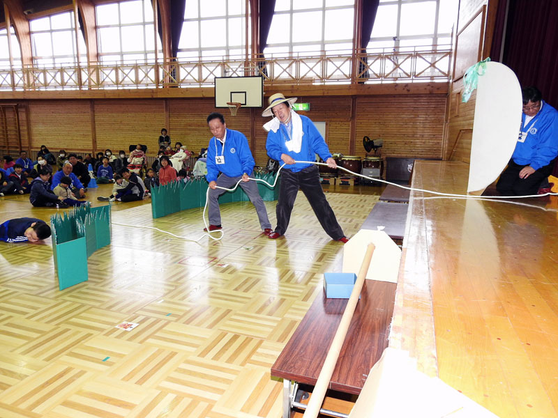黒田会長がおじいさんに扮して、カブの種をまき水を上げて大きな大きなカブを育てました。いよいよ収穫です。でも大きなカブはとても一人では引き抜くことが出来ません。おじいさんはおばあさん(柳第1副会長扮する)と協力してみますが、カブはびくともしません。そこで会場に声を掛け、めろんぱんグループに応援を頼みます。「よいとこしょ!どっこしょ!」・・・・・続いてあんぱんまんグループの生徒やクラブメンバーが手伝ってくれますが、やはり抜けません・・・・・