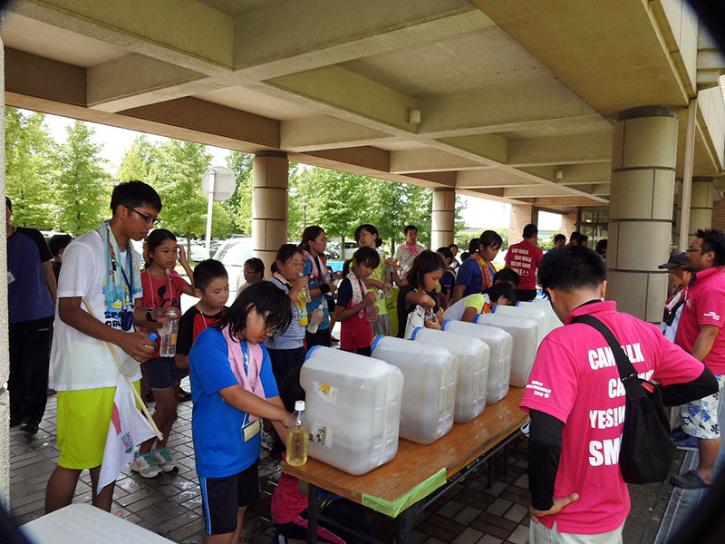 まずは子供たちをハイタッチで迎えます。猛暑の中汗を流しながらも子供たちの目は自信に満ち溢れキラキラしています。