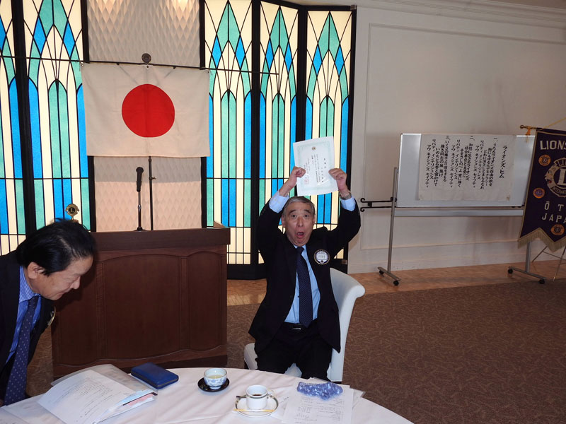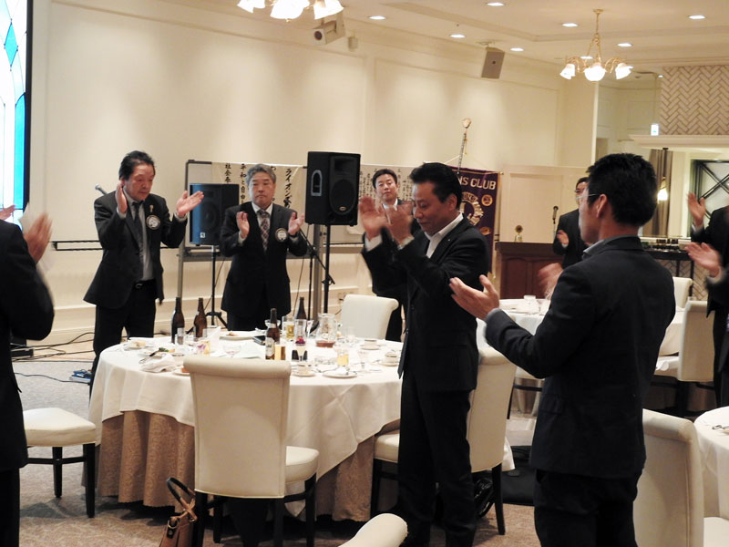 スポンサーである乾Lを先導に入場すると、割れんばかりの拍手で迎えられます。会員会則委員長の中島Lから推薦理由と承認経過が説明され、黒田会長から歓迎のメッセージが、スポンサーである乾Lからラベルボタンとランチョンバッチが着装されると、早川ライオンの誕生です。