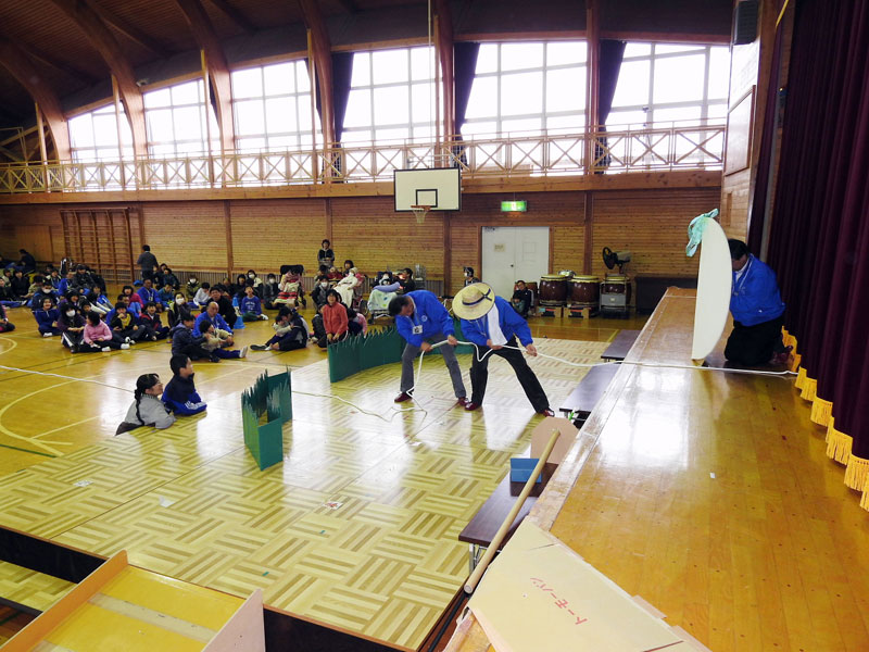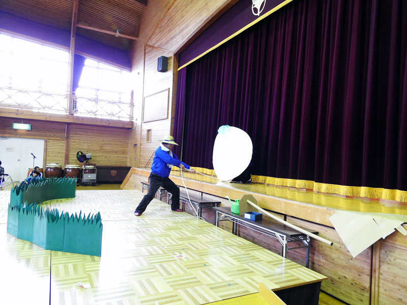 例年ですと生徒さん達が練習に練習を重ねた歌や踊り、劇等を見せて頂くのですが、今年は黒田会長の提案で我々ライオンズメンバーが子供達に「一人の力では出来ないことでも、皆が力を合わせれば出来るんだよ!」という事を表したいと云う事から、演目「大きなカブ」出演者ライオンズメンバー並びに会場の先生・生徒全員。という寸劇を企画しました。