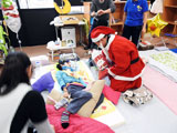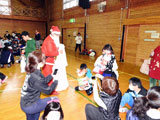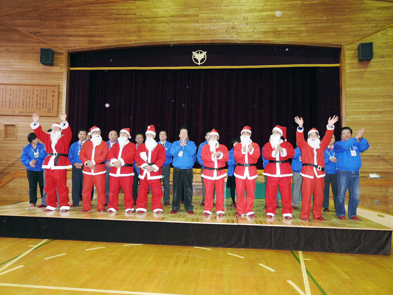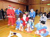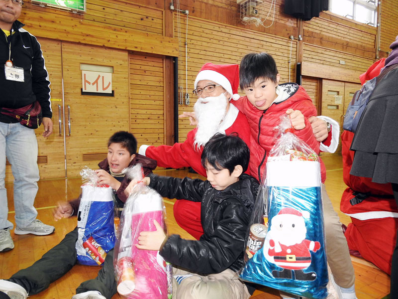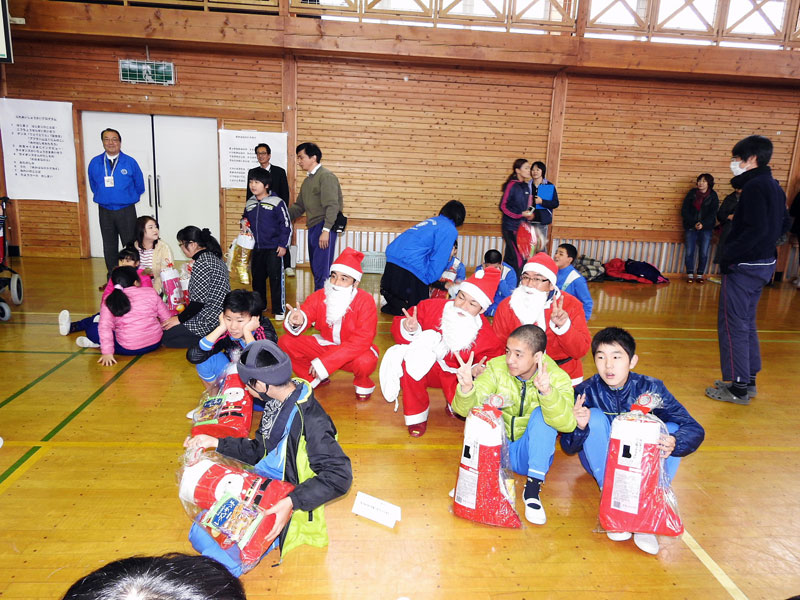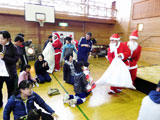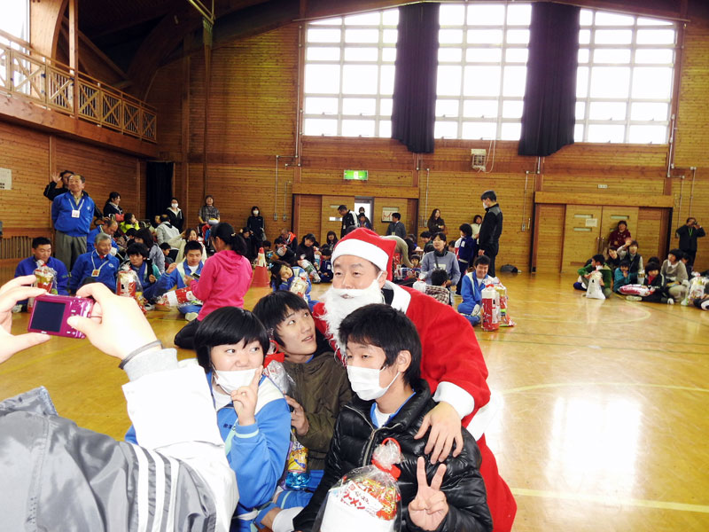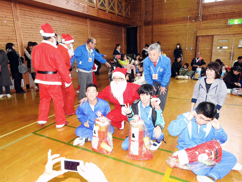 「わー抜けた!!」という歓声と同時に沢山のサンタクロースがカブの中から姿を現し、生徒たちの歓声が大歓声に替わりました。サンタクロースが生徒たちにプレゼントを配ると生徒たちは大喜びです。そして彼方此方でサンタクロースとの記念撮影が始まります。
