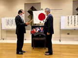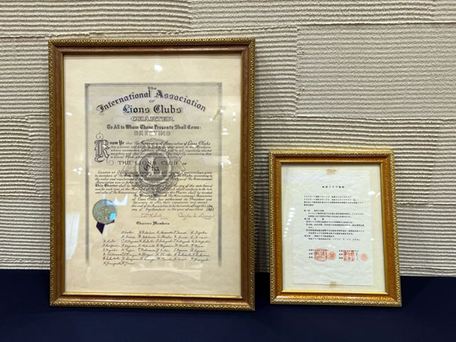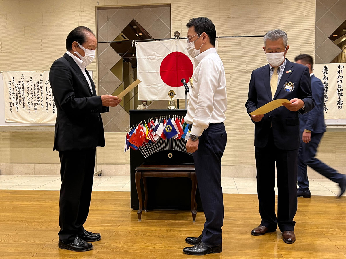 前年度会長小林知司Lより新年度会長大谷幸良Lに認証状・姉妹提携共訳書が伝達され