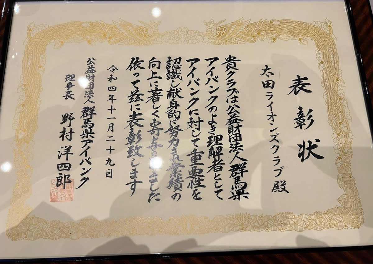 また一つ太田ライオンズクラブに名誉がもたらされました。